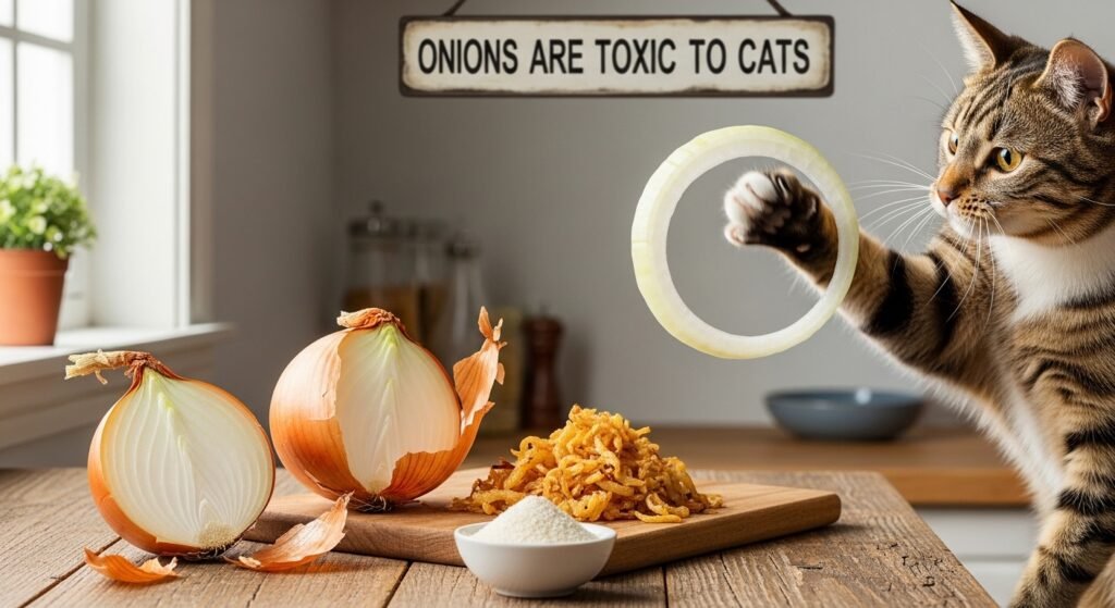 Raw onions together with cooked onions and powdered onions contain substances which harm the red blood cells of feline animals. The risk of developing anemia increases with repeated exposure to the substance.