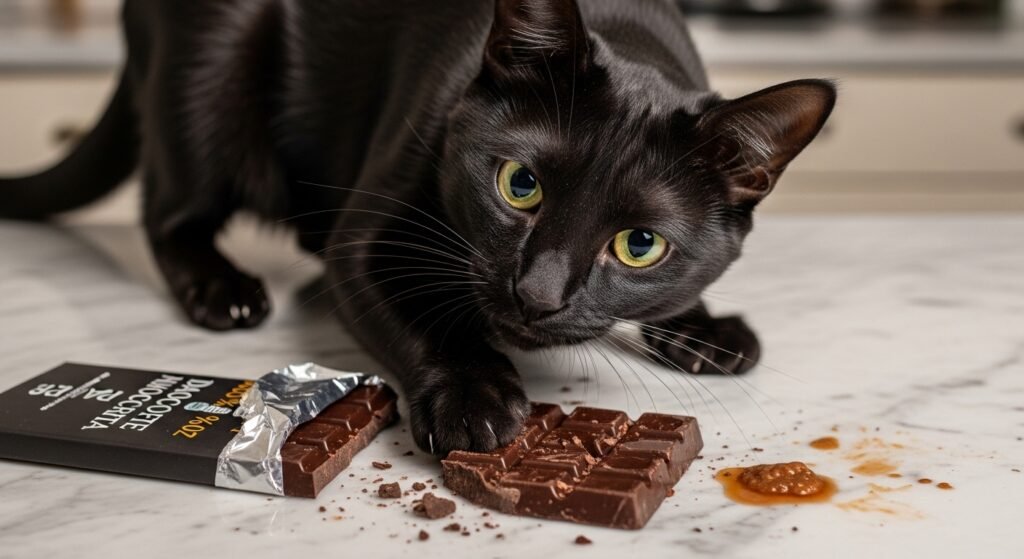 The chocolate product contains two substances theobromine and caffeine which cats experience difficulty processing. The ingestion of this substance leads to two main reactions which include restlessness and increased heart rate and gastrointestinal distress. Dark chocolate carries higher concentrations.