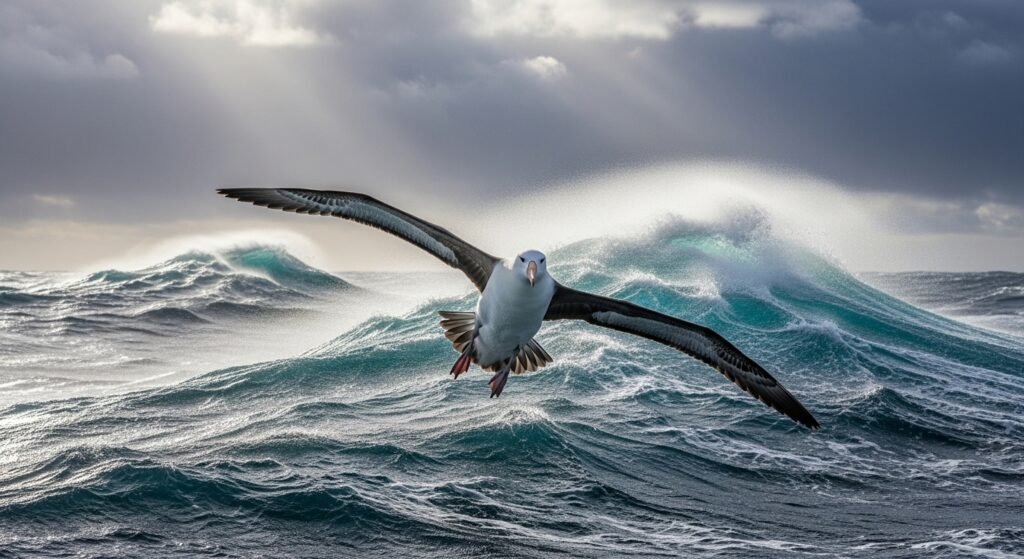 Albatrosses hack winds at 115 mph round Antarctica, 12-footers gliding days sans flap. Bounce gust layers glider-style, beaks knife fog. Trackers log Chile-to-NZ nonstops. Wave skims for takeoff in 100-knots. Wings win forever.