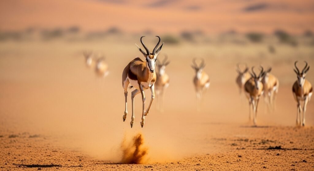 Springboks pronk 55 mph Kalahari style, leaping four feet helicopter-twisting to troll lions. Hoof stomps boom fake hurts, dust fools chasers. Herds shimmer silver, trek 30 miles daily. Dry spells? Pronk harder. Antelope trampoline.