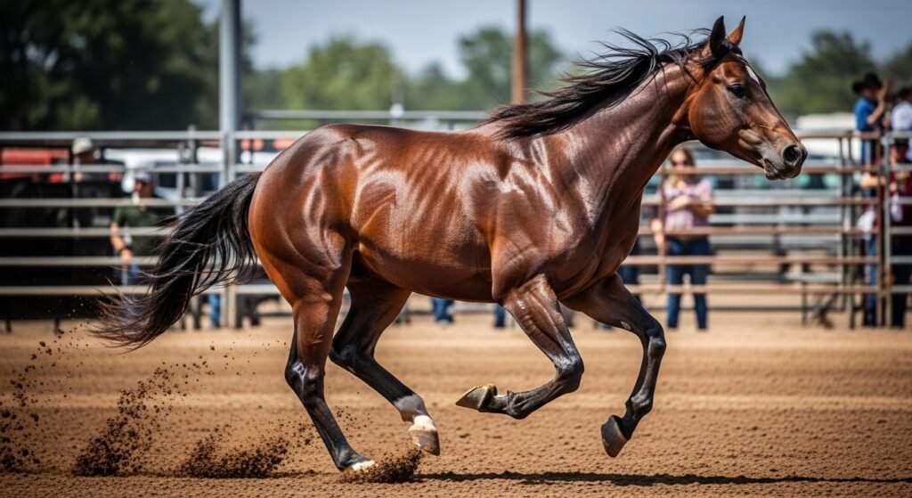 Quarter horses detonate 55 mph dirt drags, cowboy-bred for steer hauls. Hearts triple ours, legs blur 24/sec. OK tracks: 21-second quarters. Blue roans rule roping. Pure ranch thunder.
