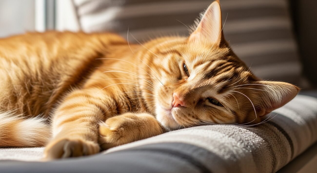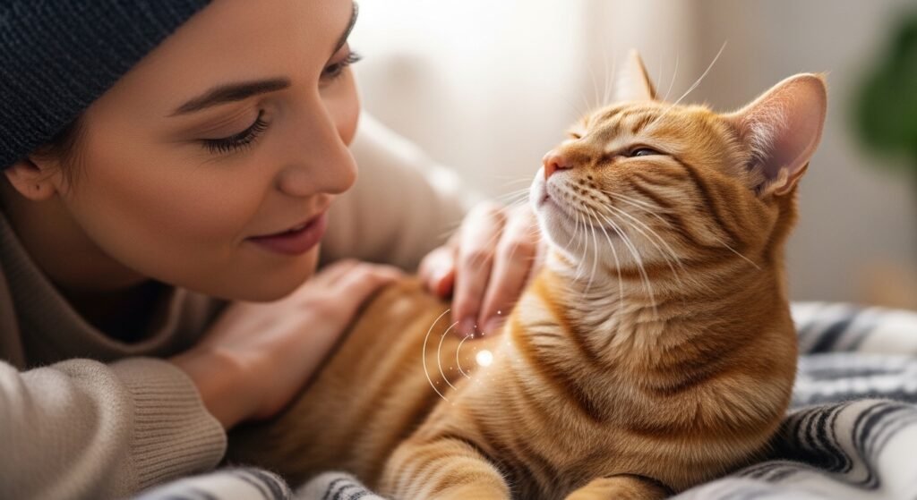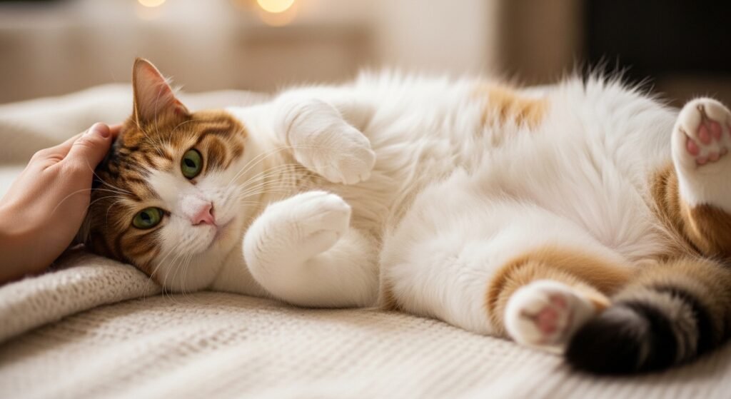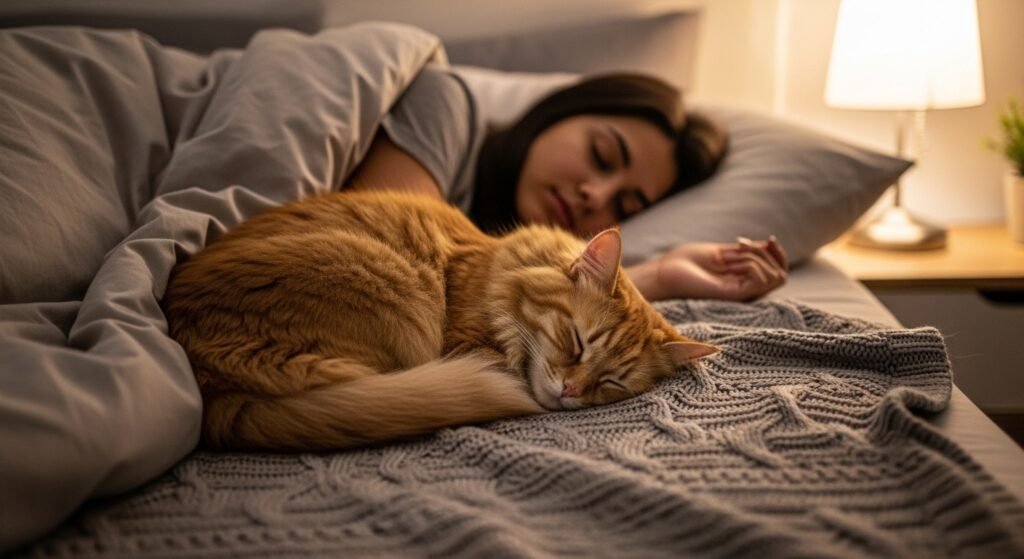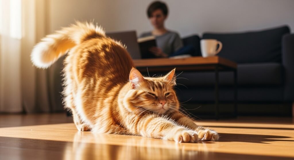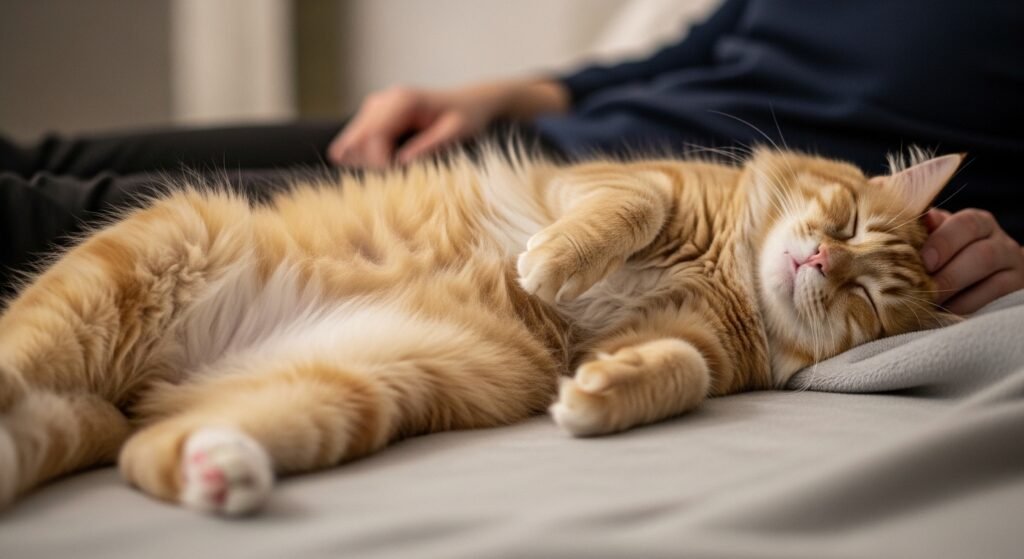 A cat shows complete trust when it stretches its body to the maximum and shows its stomach and snores lightly because it sleeps next to you. Deep sleep leaves them unaware of surroundings for brief periods. Your presence establishes their most secure space because they only interact with you in that area.