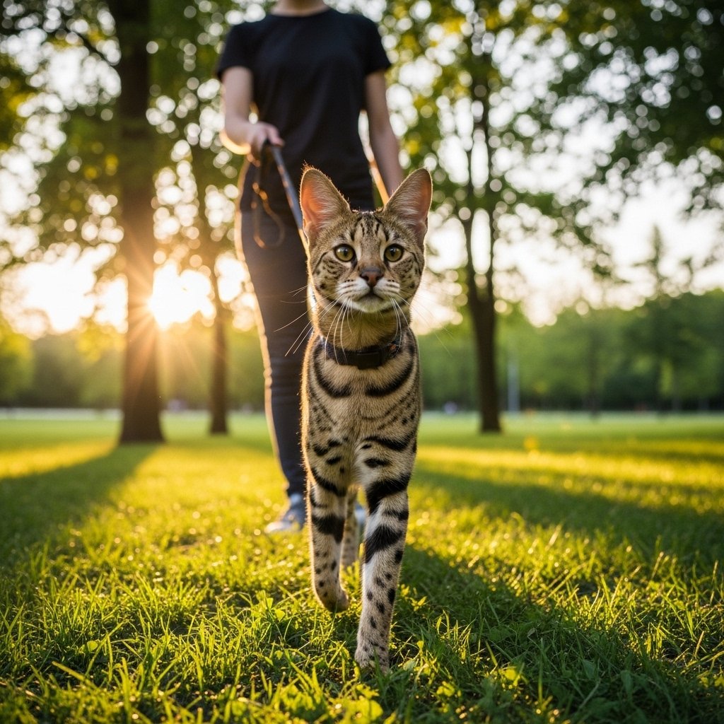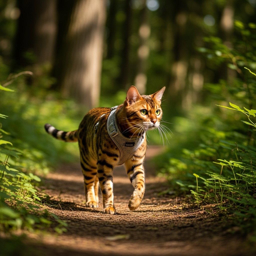 The Savannah cat breed demonstrates intellectual capacity and physical stamina which permits them to solve problems through their educational activities. Most cats learn to walk using a harness because they enjoy active social interactions with humans.