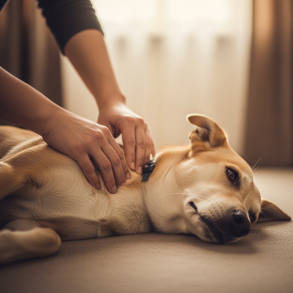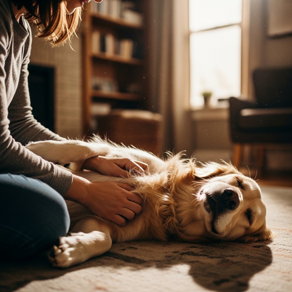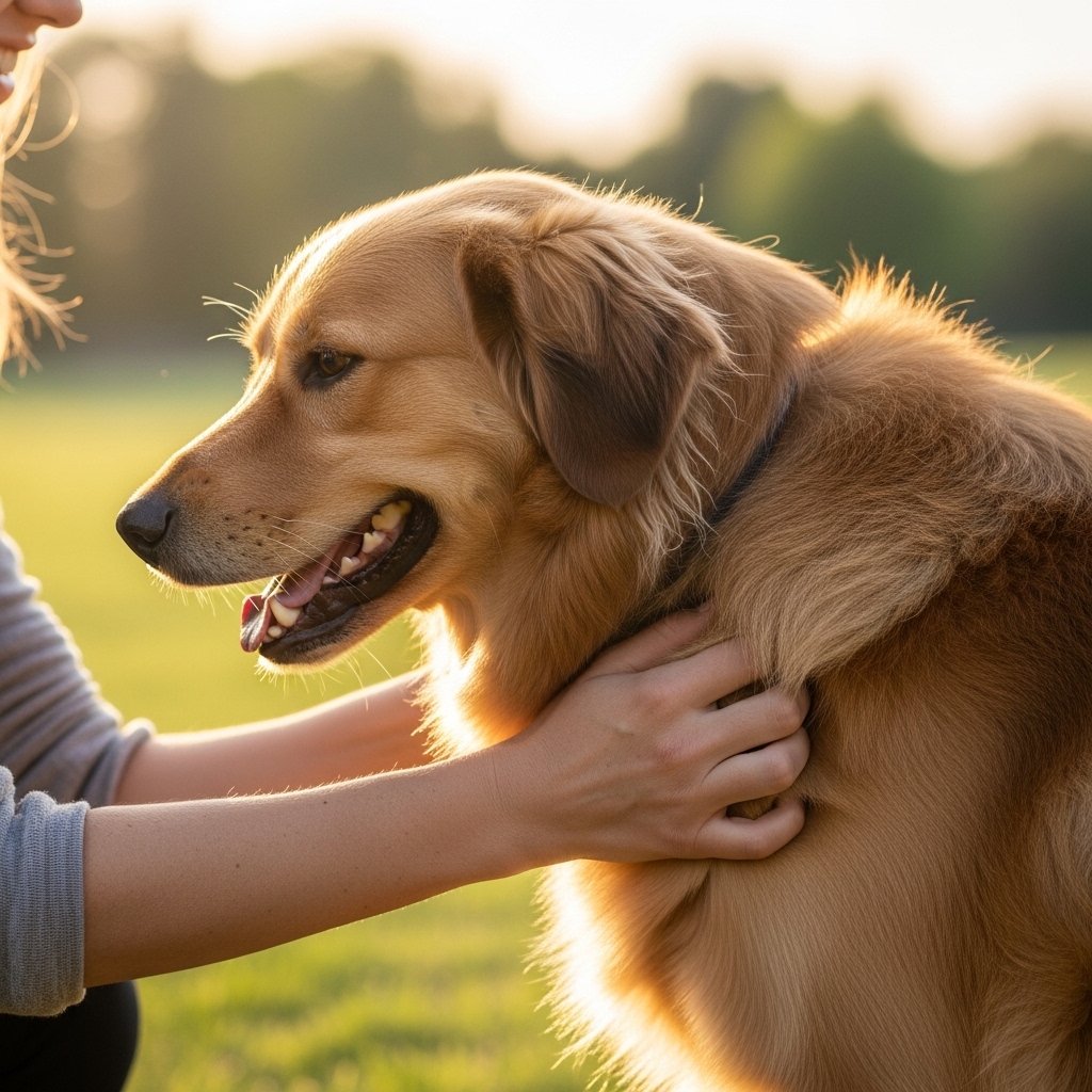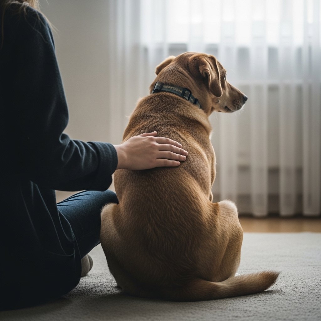 A person can use their hand to touch their dog back to provide comfort. Dogs show their trust through their stillness which they use instead of their active movements.