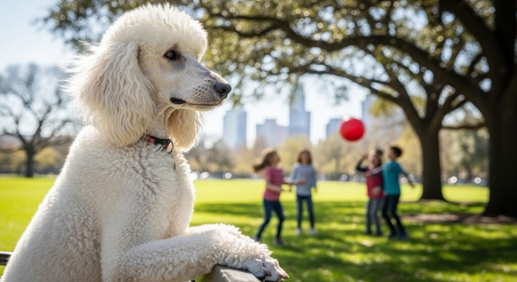 Poodles possess both intelligence and environmental understanding. They develop a pattern of watching their surroundings which they use to observe and respond to events while they seem to evaluate situations before making their response.