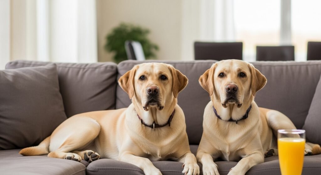 Labradors turn every family gathering into their personal time to join. They show their active involvement in everyday activities by their behavior which includes resting on the couch and welcoming visitors.