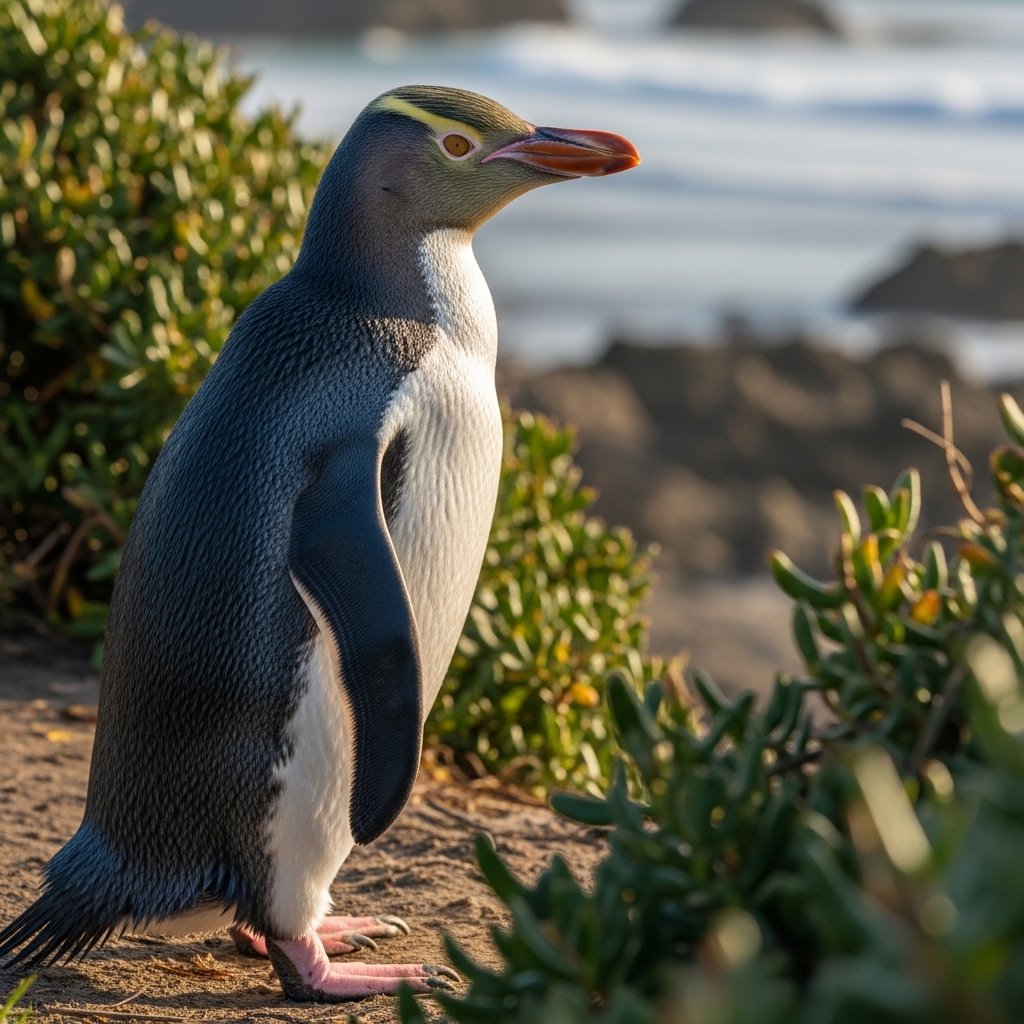 Known locally as hoiho, this penguin nests in secluded coastal areas. The animal shows its distinctiveness through pale yellow bands that extend across its head.