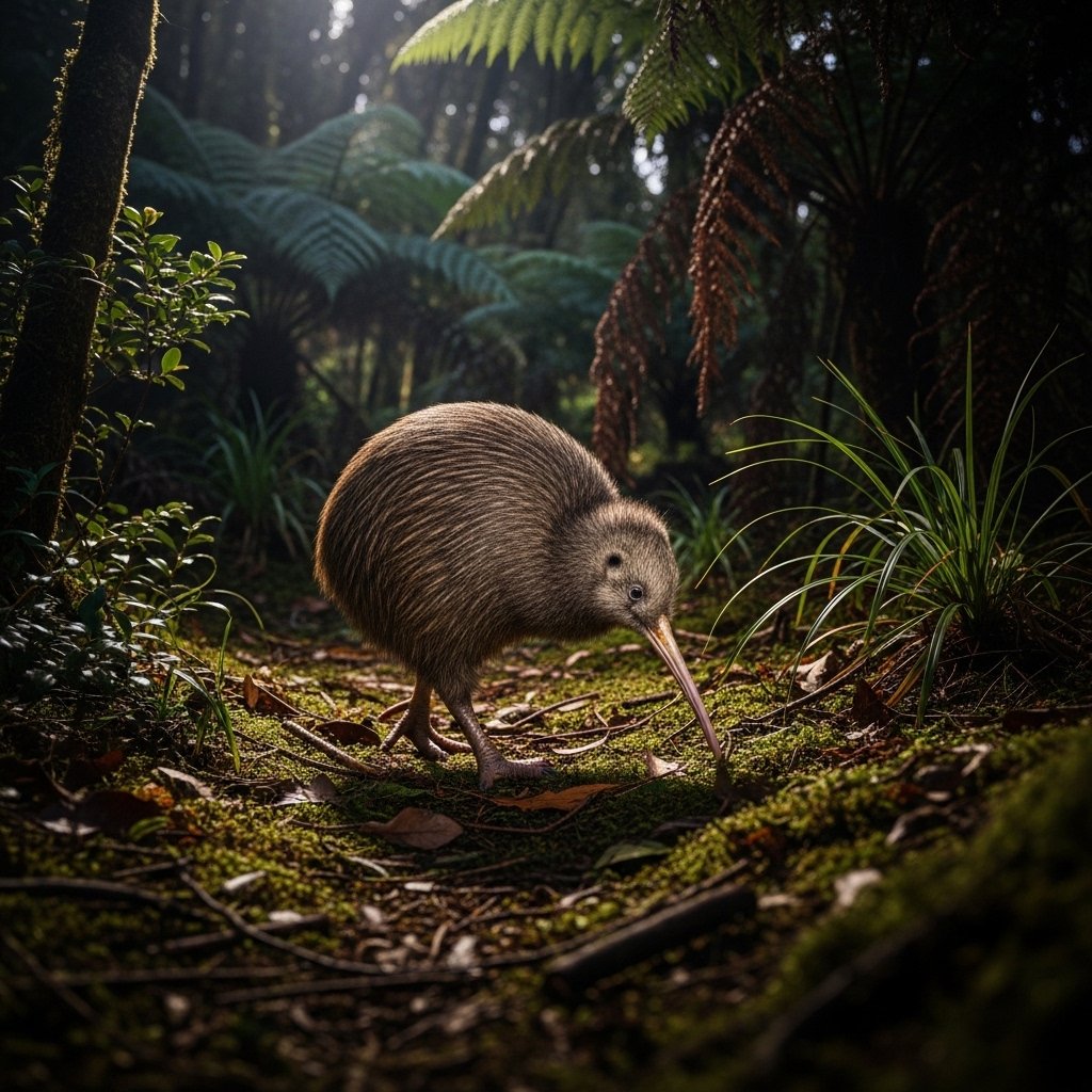The kiwi serves as the national emblem of New Zealand while it exists as an uncommon flightless bird which features whisker-like plumage. The creature searches through forest undergrowth during nighttime hours to find insects and worms using its extended beak.