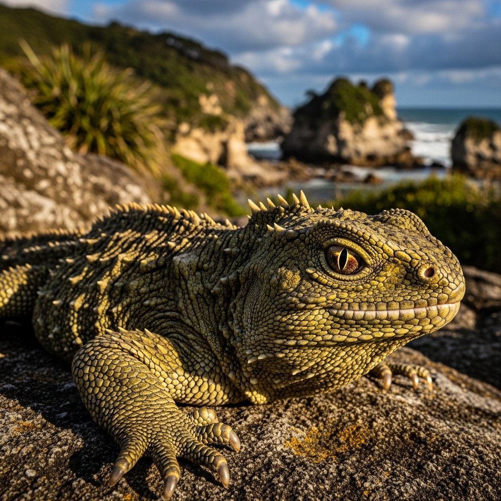 The tuatara exists as a “living fossil” which resembles a lizard yet belongs to an ancient evolutionary family. The species has maintained its original form throughout three million years of history.