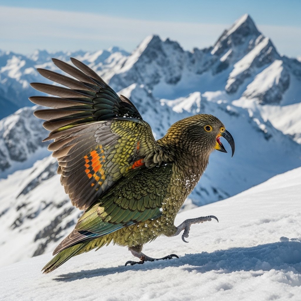 The kea functions as an intelligent alpine parrot which displays both curiosity and problem-solving abilities. The bird enjoys interacting with mountain climbers who visit its natural habitat.