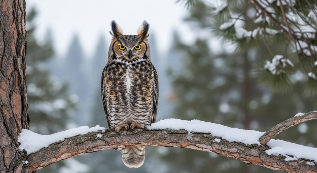 The great horned owl, also known as the tiger owl or the hoot owl, is a large owl native to the Americas. Great horned owls remain protected as a bird of prey which requires permits to disturb their nesting activities.