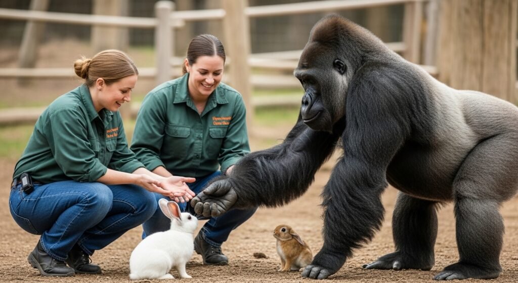 The staff provided supervised monitoring which allowed peaceful gorilla contact with smaller animals who approached them with curiosity.