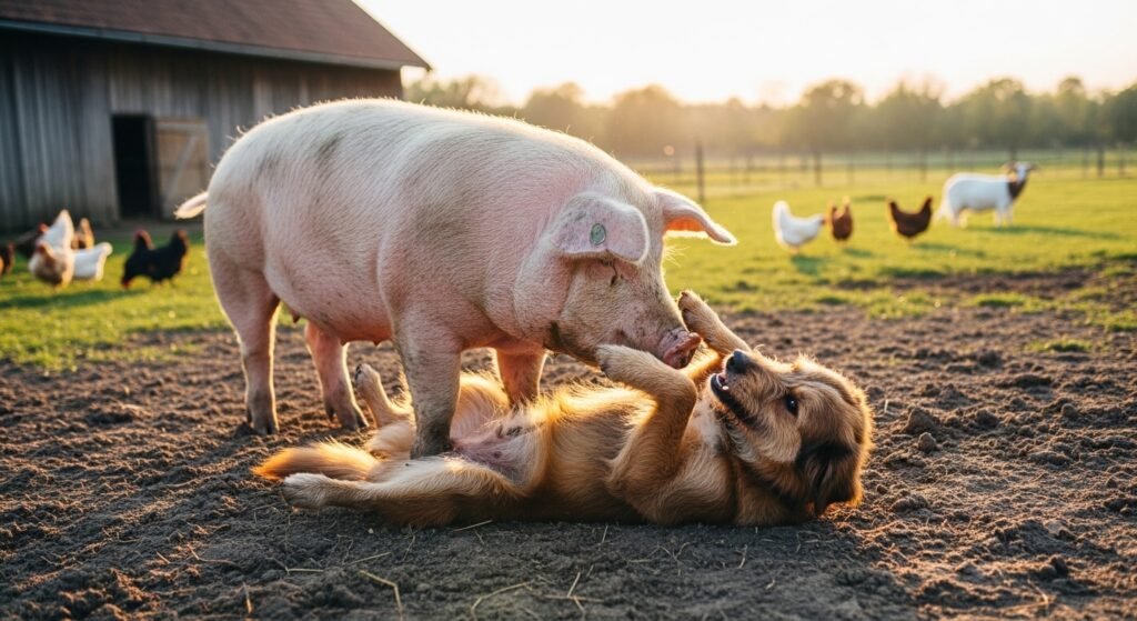 Pigs and dogs raised together on farms establish a playful relationship which involves them sharing their living space and daily activities.