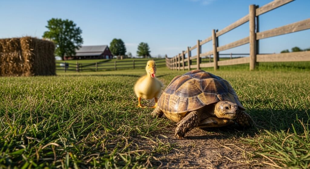 On farms, ducks occasionally follow tortoises which move at a slow pace to create funny situations of daily companionship.