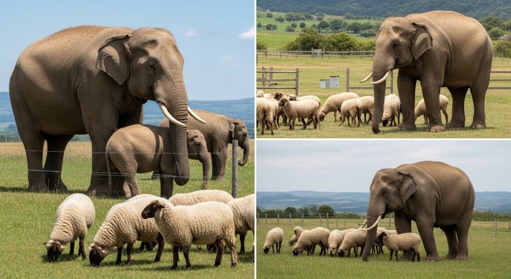 Sanctuary stories display instances where sheep share their grazing space with elephants to create peaceful interactions between these two animal groups.
