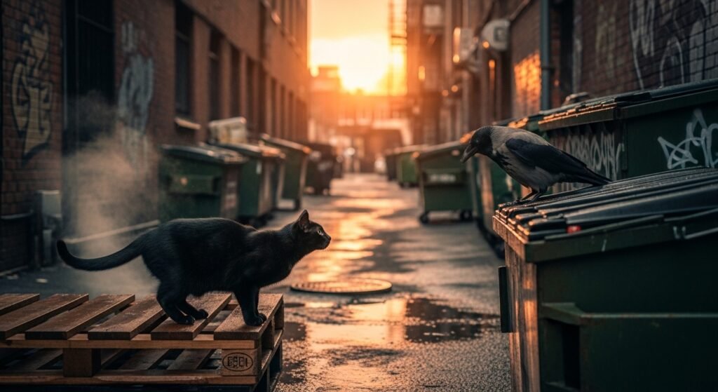 Urban settings create situations where intelligent birds and domestic cats establish a relationship which combines caution with curiosity.