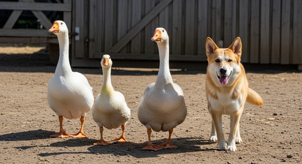Geese that grow up alongside dogs develop a bond which enables them to walk together through farmyards.