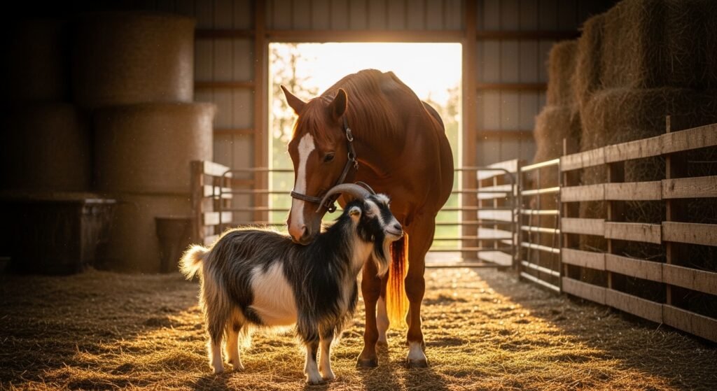 Goats establish friendship ties with horses which they find inside barns and across open pastures. Their shared grazing space encourages steady companionship.