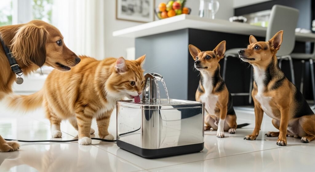 The body uses water to help with digestion and maintain healthy kidney functions. The establishment of water stations requires fresh water to be available at all times throughout the day. Some pets use water fountains to drink more water throughout the day.