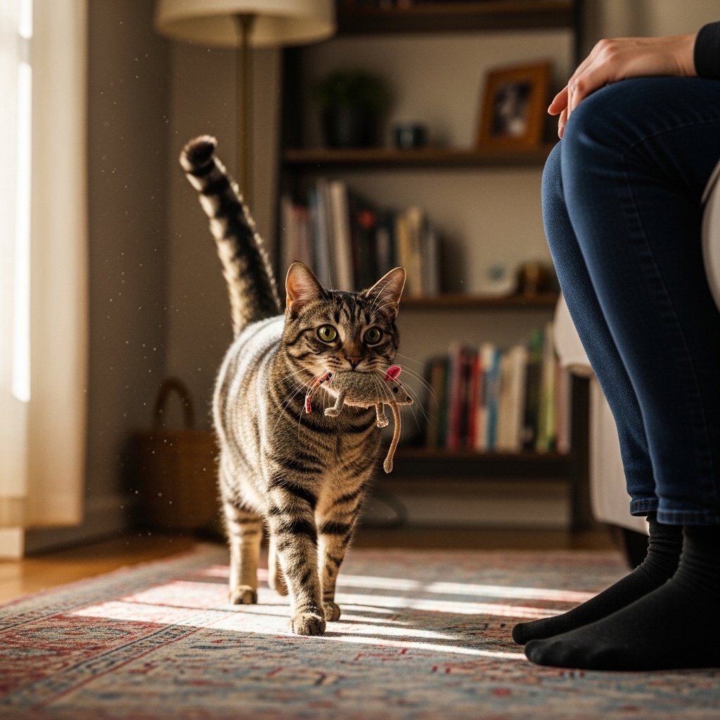 The act appears to deliver random clutter but it actually demonstrates a basic human practice of sharing. Cats in nature will return the animals they have caught to their social group. The act of offering you toys or objects shows their wish to make you part of their social group.