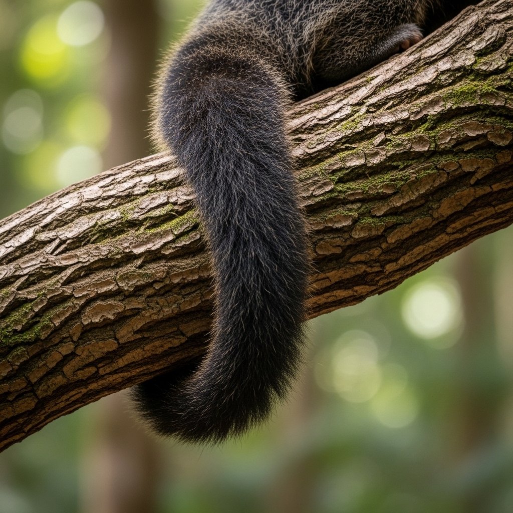 The binturong uses its prehensile tail which exists as one of the rare carnivore features to securely hold on to tree branches. The animal uses this skill to navigate the tree tops which allows it to distribute seeds at high altitudes above the ground.
