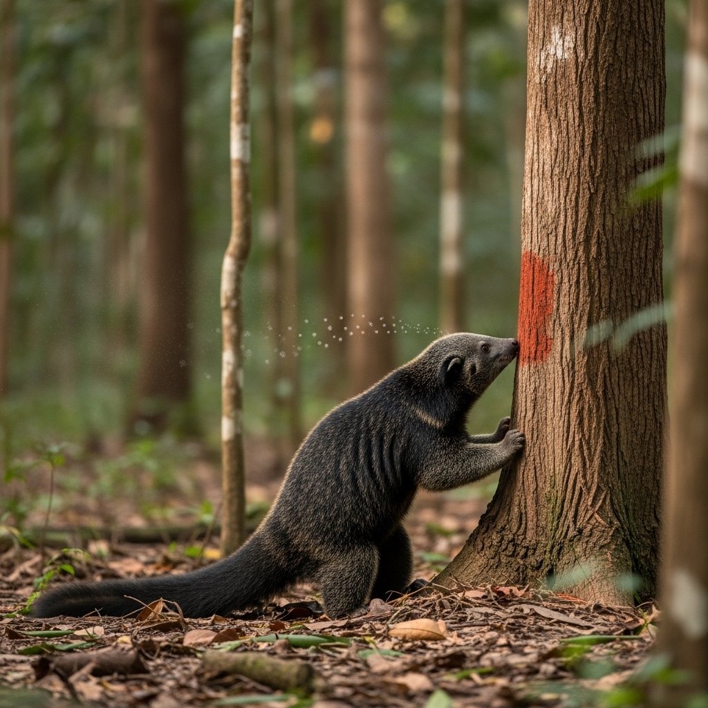 Binturongs produce a scent which people describe as resembling buttered popcorn. The scent originates from a chemical compound which exists in their scent glands. The practice of marking territory enables animals to decrease direct conflict while establishing spatial boundaries throughout their forest territory.