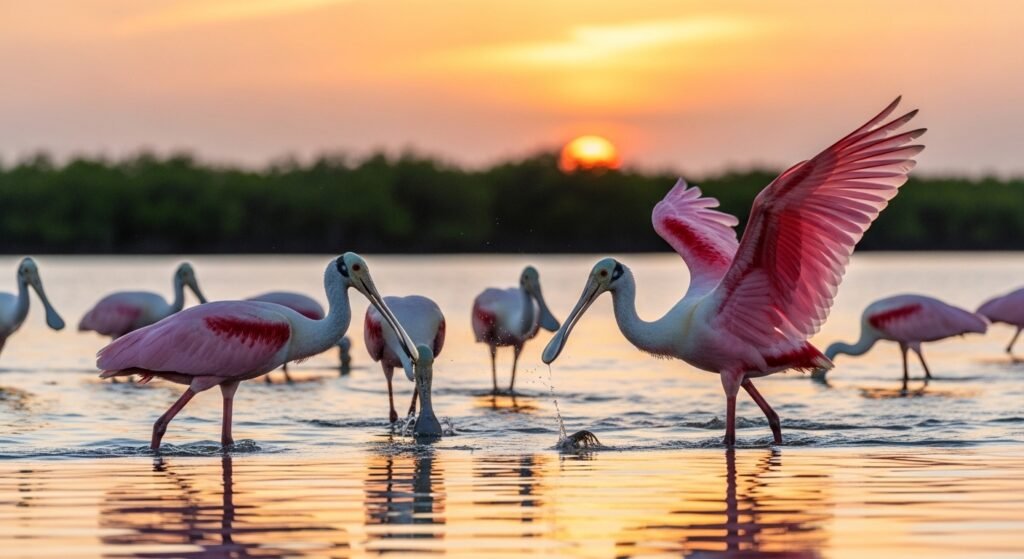 Birds use their flattened spoon-like bills to sweep through shallow water by moving their heads from side to side. The Roseate spoonbill detects small fish and crustaceans through touch while wading.