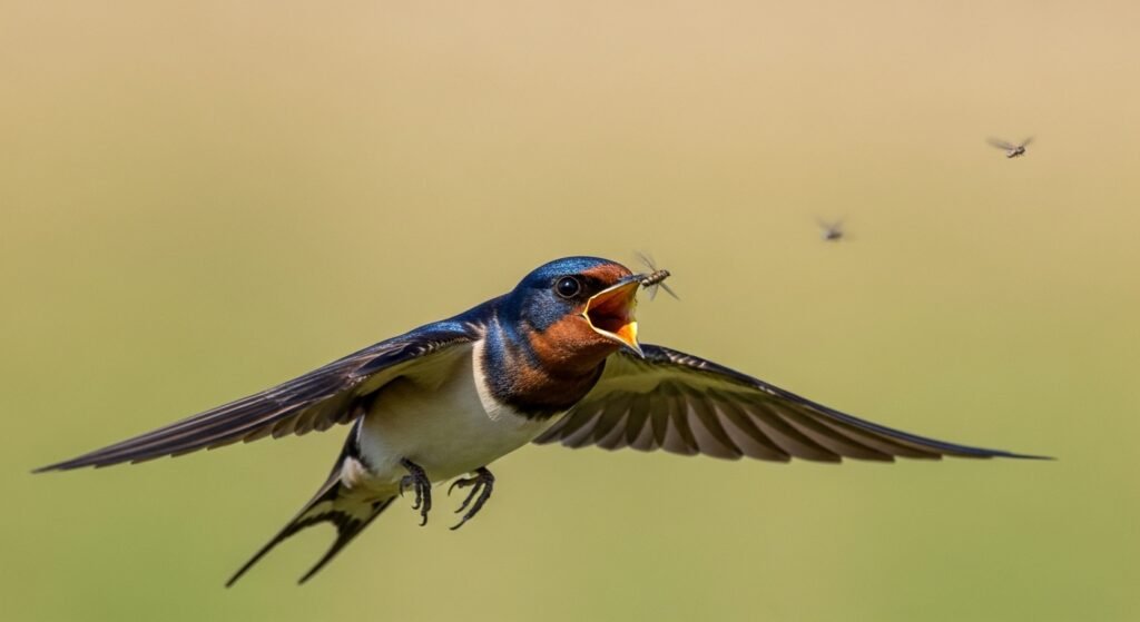 Birds use their short beaks and wide mouths to catch insects which fly between them. The Barn swallow sweeps through the air with precision to capture flying insects.
