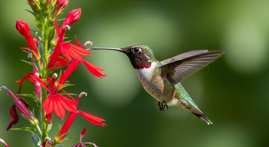 Birds use their slender and elongated beaks to drink nectar which exists deep within flowers. The Ruby-throated hummingbird uses its beak together with its specialized tongue to drink sweet liquid in an efficient way.