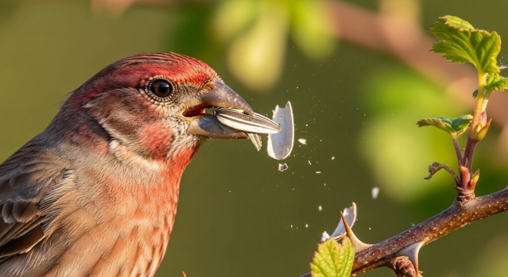 Birds with short and thick and triangular beaks use them to break down seeds. The House Finch uses its strong jaw muscles to open hard shells so it can eat the nutritious kernel which lies inside.