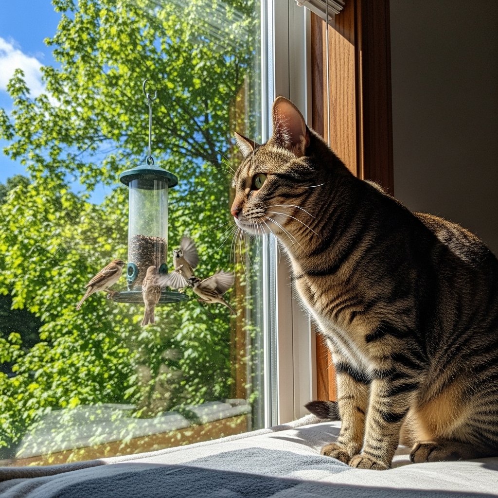 A window view filled with birds or movement can captivate a cat for hours. This quiet stimulation satisfies their natural hunting instincts safely indoors.