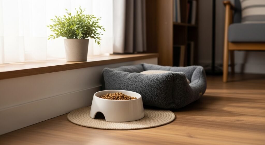 The feeding area should contain the food bowl which needs to exist in a space that experiences limited foot traffic. A peaceful environment encourages relaxed eating and prevents distractions that might cause unfinished meals or anxiety.