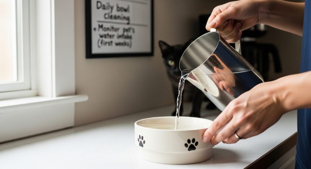 The availability of clean water which people can easily access enables effective hydration which promotes better health. The bowl requires daily cleaning while you should observe how much your pet drinks during the first weeks.