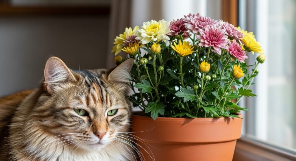 Chrysanthemums have pyrethrins, which are composites of germicides. In cats, ingestion causes drooling, vomiting, diarrhea, and lack of cooperation. Some cats may also develop skin infection or acuity responses after contact.