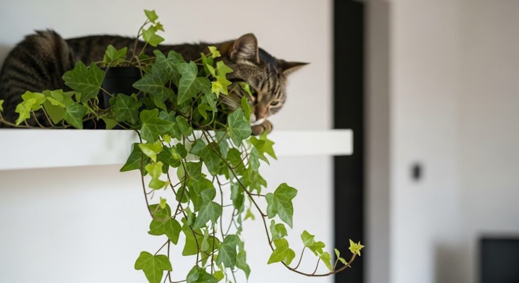 English ivy causes problems related to the gastrointestinal tract. Cats experience issues such as vomiting, diarrhea, and pain upon ingestion. The skin can also cause infection or antipathetic reactions in sensitive cats.