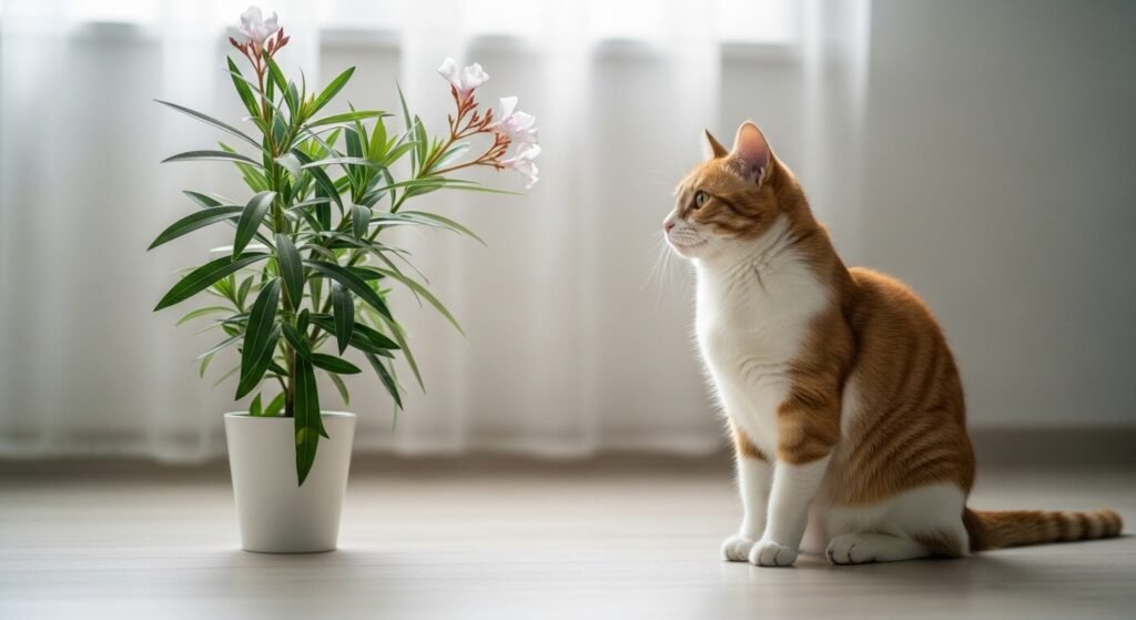 Oleander is largely venomous and dangerous to cats. It contains cardiac glycosides that affect heart rate and function. Indeed small ingestions can bring drooling, puking, temblors, and potentially fatal cardiac failure.