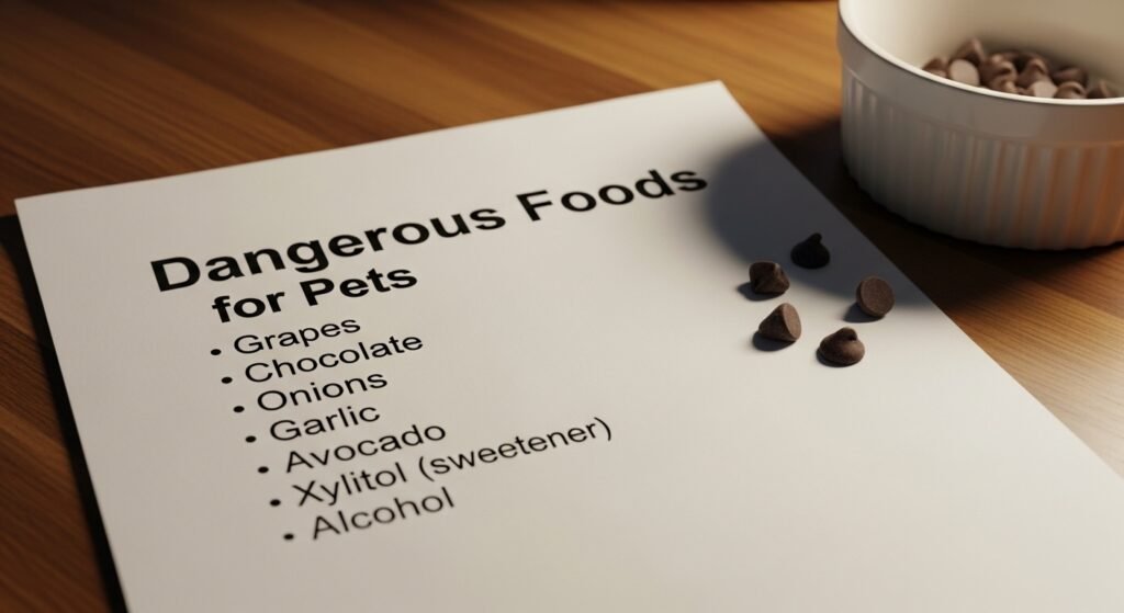 Printing out a list of dangerous foods like grapes and chocolate helps remind everyone what not to drop. It is a simple way to stop accidents especially when guests try to sneak your pet a treat.