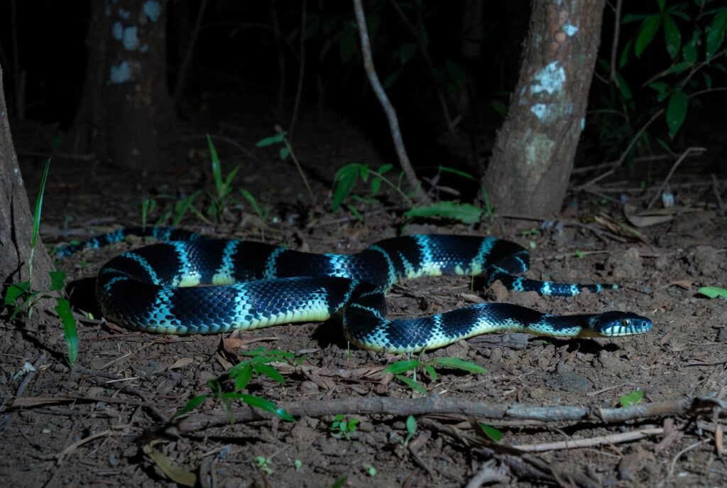 Primarily nightly, the blue krait has extremely potent neurotoxic venom. mouthfuls frequently do while victims are sleeping, and symptoms may appear late, making treatment delicate.