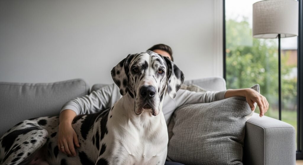 They love leaning against their owners, resting their heads on shoulders, and trying to coil up in stages. Great Danes are deeply attached to their families and frequently seek physical contact as consolation. Their calm, gentle disposition makes their cuddles feel unexpectedly soothing, indeed when they take up most of the couch.