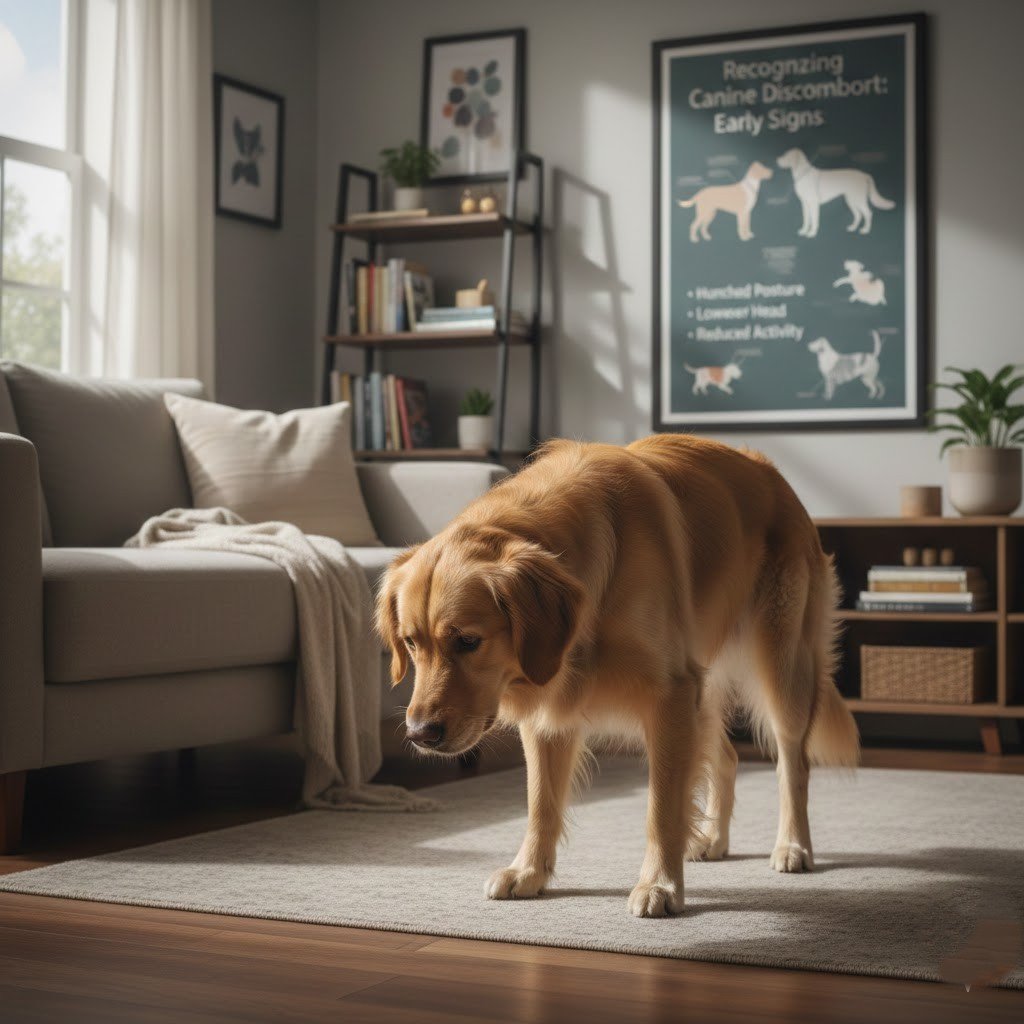 Discomfort may be indicated by a hunchback, low head or rigid movements. Dogs can also change posture automatically to shield sensitive parts or decrease load.