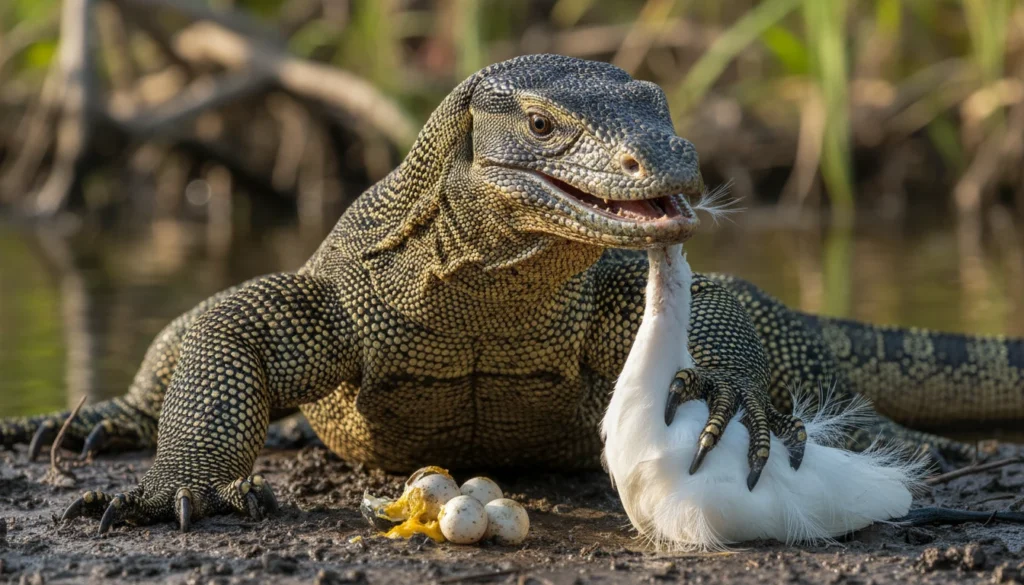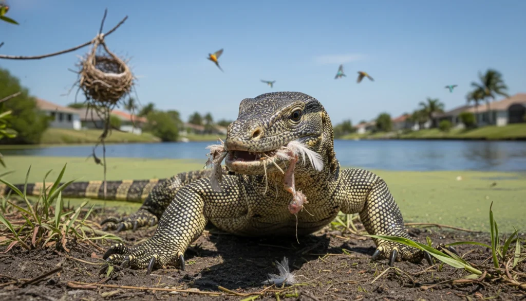 Nile monitors are opportunistic hunters capable of feeding on fish, birds, small mammals, reptiles, and eggs, which gives them a competitive edge in unfamiliar environments. Their varied diet increases the likelihood that they will compete with native species for food while also directly preying on vulnerable wildlife that has not evolved defenses against such a large and agile predator.