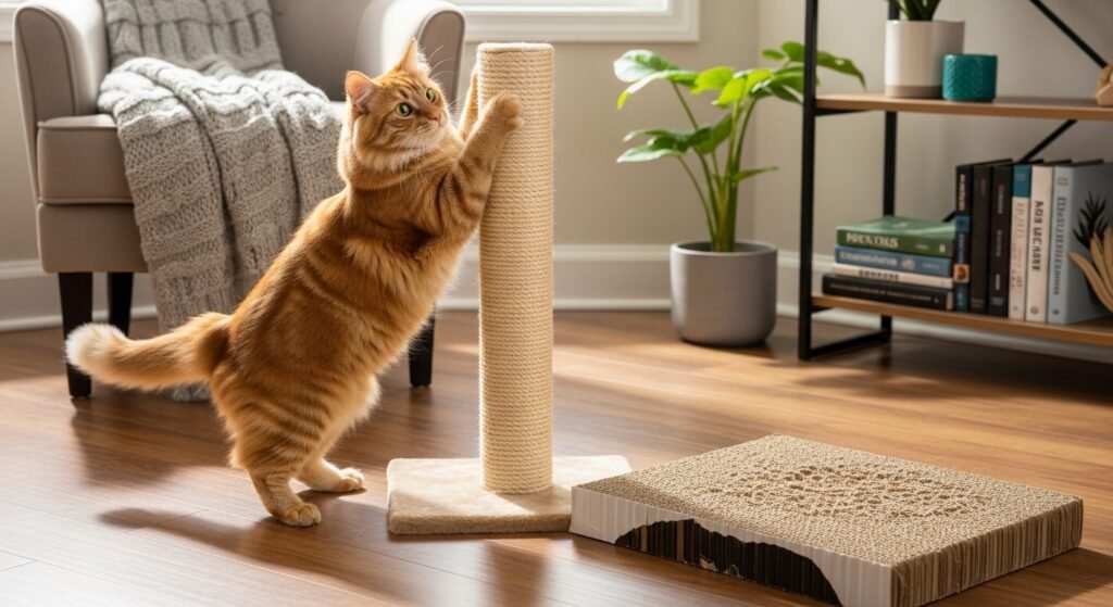 The cat uses scratching to keep its claws healthy, to stretch its muscles, and to mark its territory. Providing your cat with both vertical and horizontal scratching options enables it to select its preferred scratching method which helps to decrease its irritation while keeping your home furnishings intact.