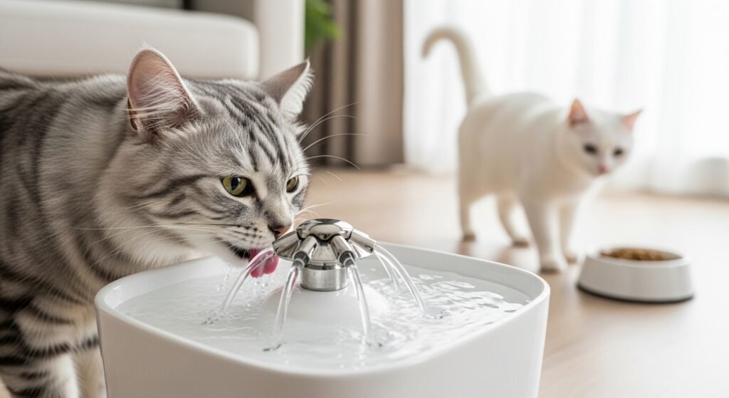 Daily fresh water replenishment promotes kidney function and boosts overall health. Some cats prefer moving water which makes fountains an attractive option for them. People who want their cats to drink more should put water dishes away from their cat’s food.
