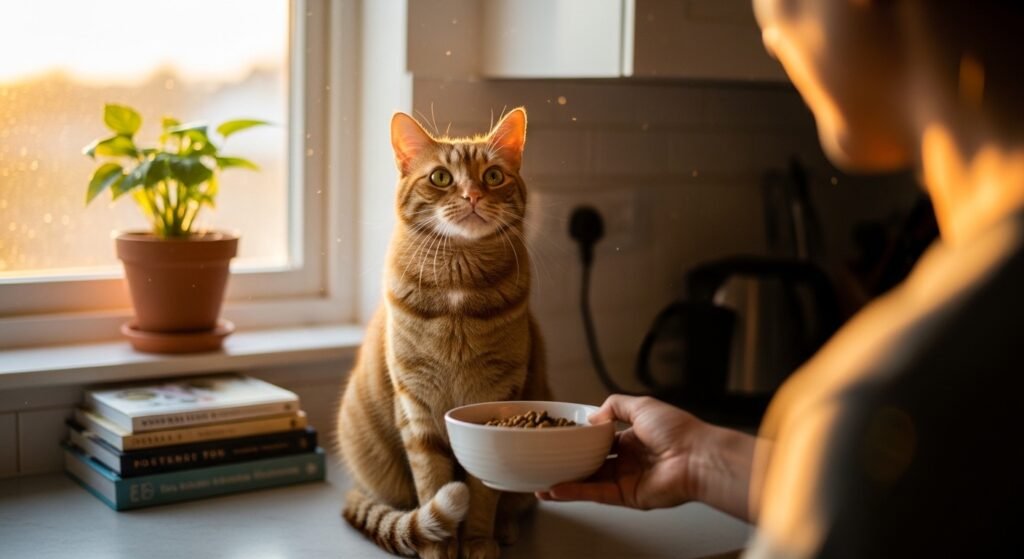 Cats follow established patterns throughout their daily lives. When people feed their cats at the same time each day their pets develop a regular digestion pattern which results in a predictable feeding schedule. The practice of scheduled feeding times creates regular contact between cats and their owners which deepens their relationship.