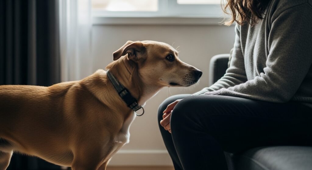 The dog shows strong attachment to you because it moves closer during loud sounds and new environments instead of leaving. Your presence acts as a stabilizing anchor.