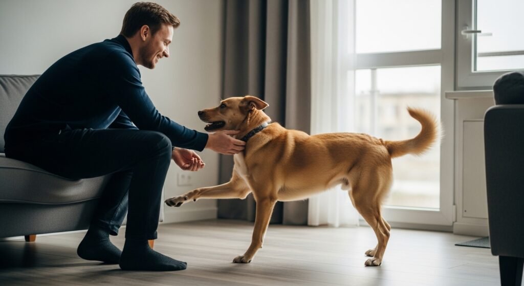 The dog shows consistent enthusiastic behavior after their owner returns from brief absences because of their positive emotional connection with the person. The joy that people experience comes from their strong connection with others which makes them excited to be with their friends.