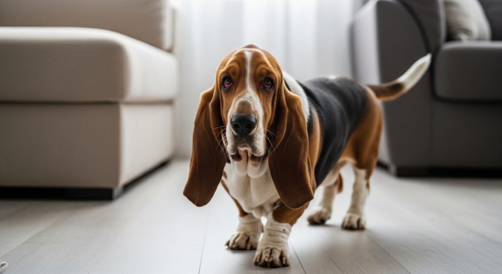 Basset Hounds move through their day at a slow and unhurried speed. Their mellow personality and steady temperament contribute to a peaceful home atmosphere.