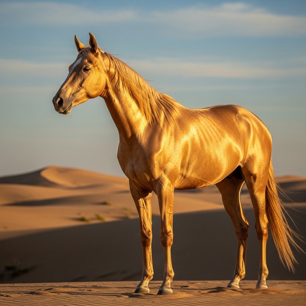 The Akhal-Teke is often called the “Golden Horse.” This is because its coat has this shiny quality that makes it look almost glowing when the sun hits it. It comes from a place called Turkmenistan. This old breed is known for being able to go for a long time without getting tired. It also has a lean and elegant body. Its skin is thin and its hair is fine which helps it have that radiant look.