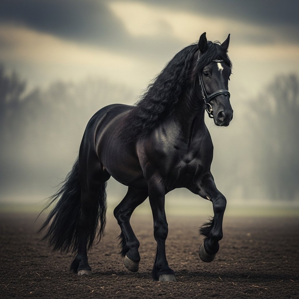 The Friesian horse has a coat as black as night. It also has a thick mane and moves in a way that is both strong and elegant. This makes it look very impressive. This breed comes from the Netherlands. You often see it in movies because it looks so graceful and almost royal.