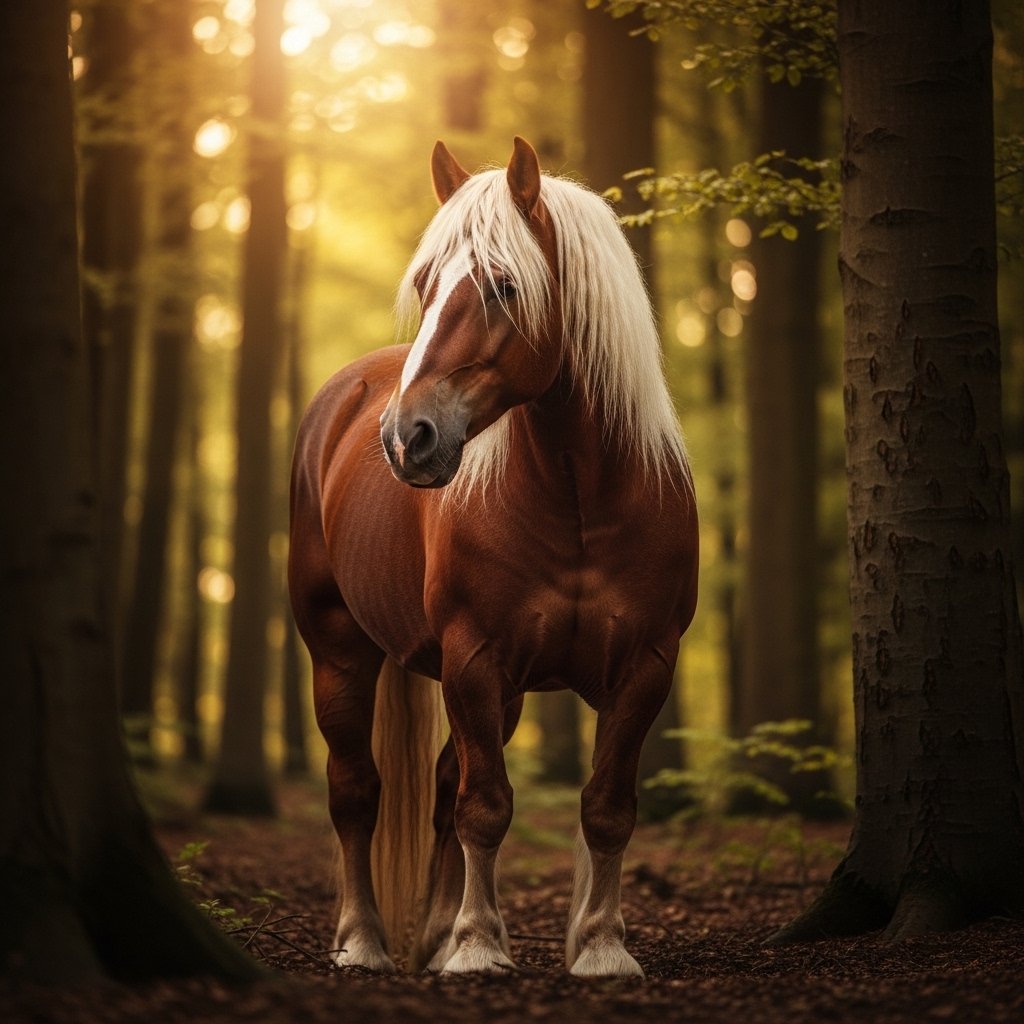The Black Forest Horse has a deep brown coat and a mane that is light colored like straw. This German breed looks like it belongs in a storybook forest. Its strong solid build looks wonderful next to its bright coloring.